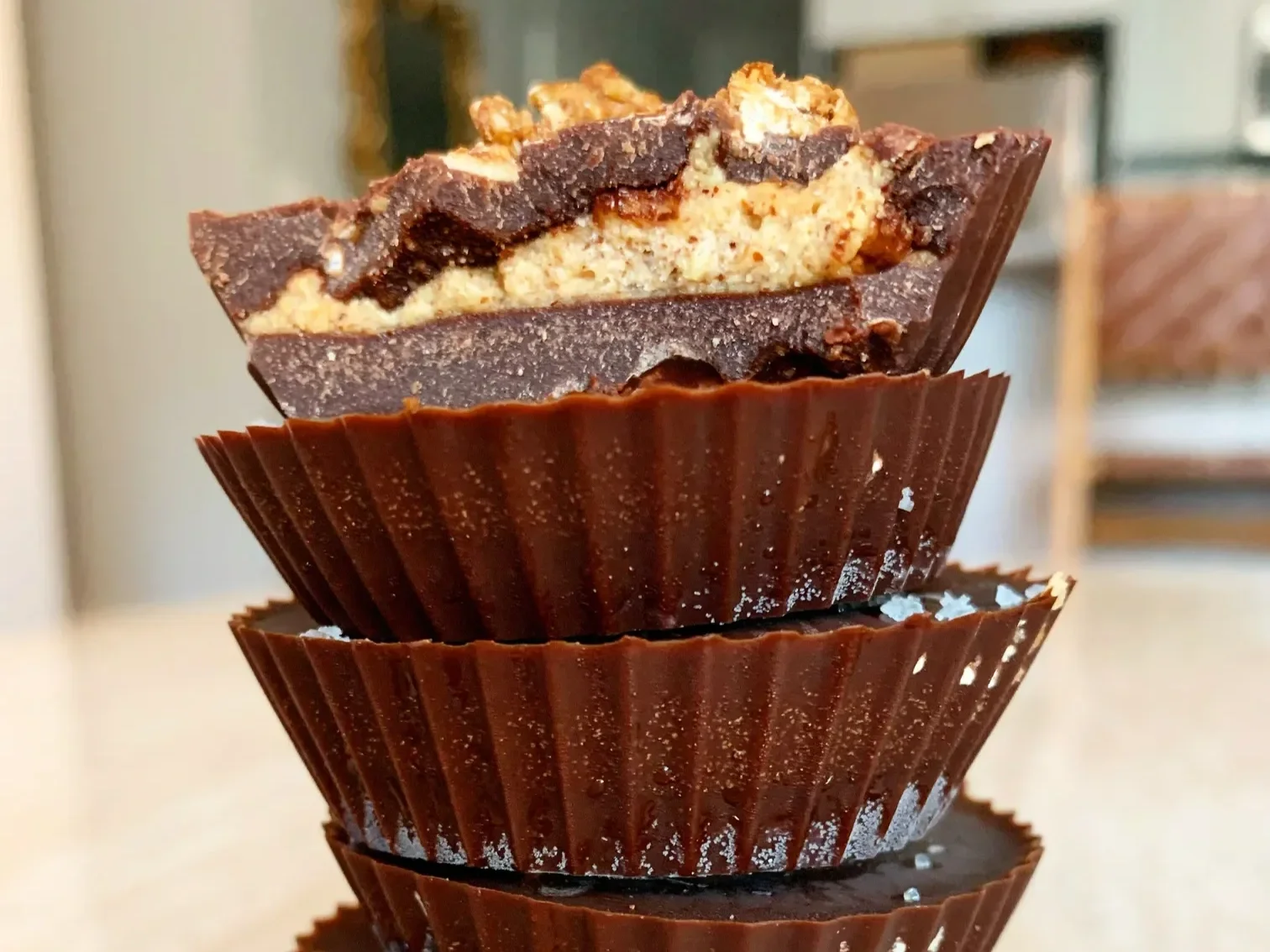 Add 1 more TBSP of chocolate over the almond butter in each muffin liner. Sprinkle with flaky sea salt. Place in the freezer and let set for at least 15 minutes.